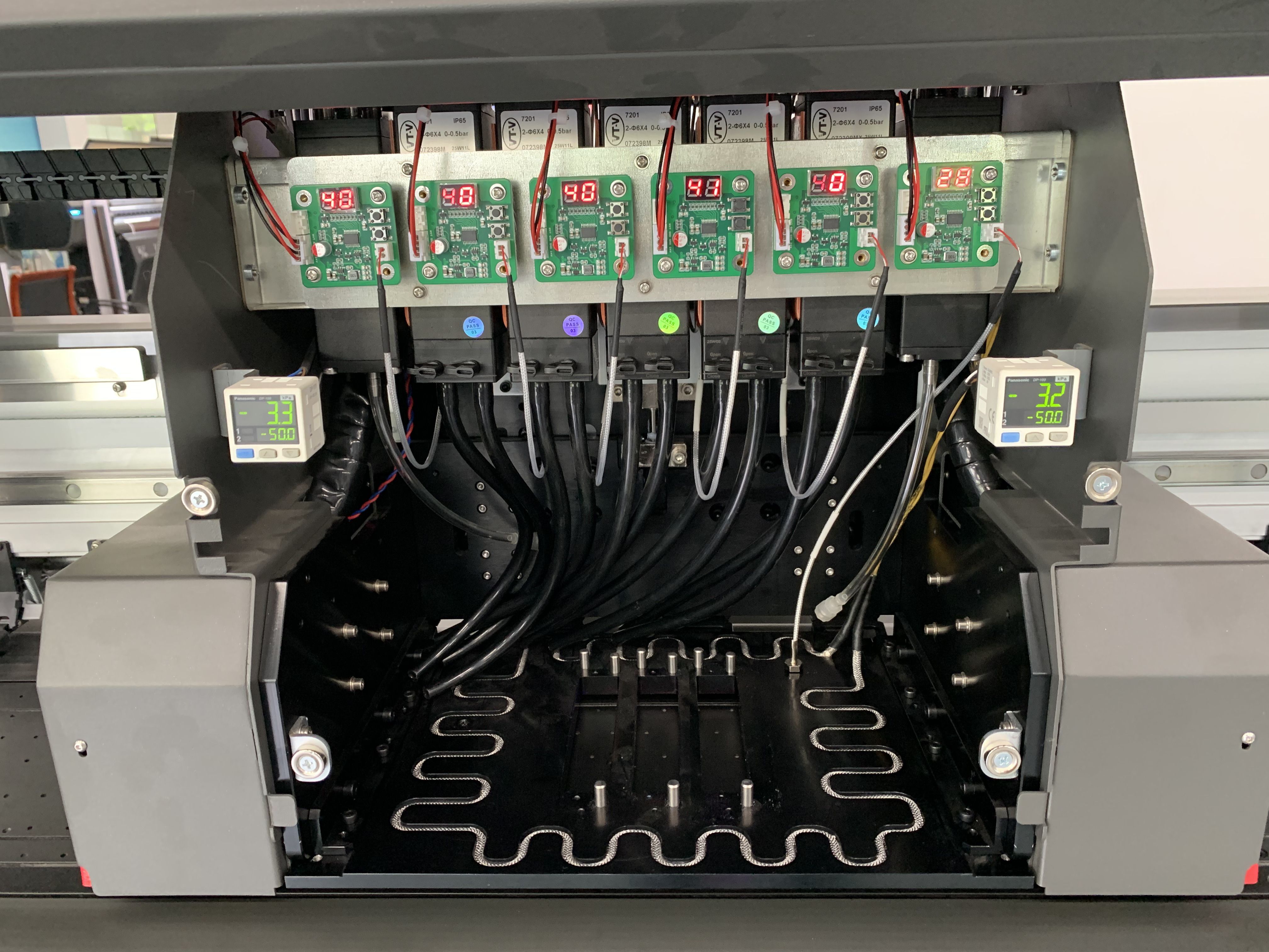Независимые системы подачи для цветных и белых чернил позволяют установить оптимальное отрицательное давление для каждого типа, обеспечивая стабильную работу сопел и предотвращая перетекание чернил разной вязкости.