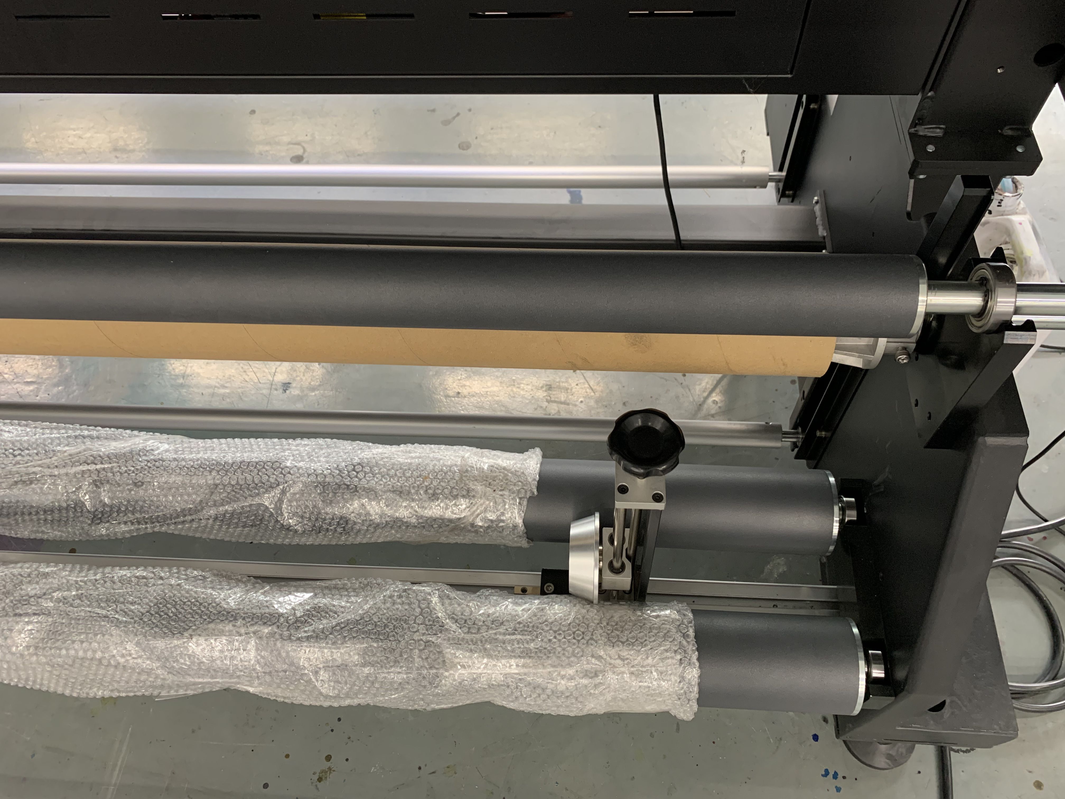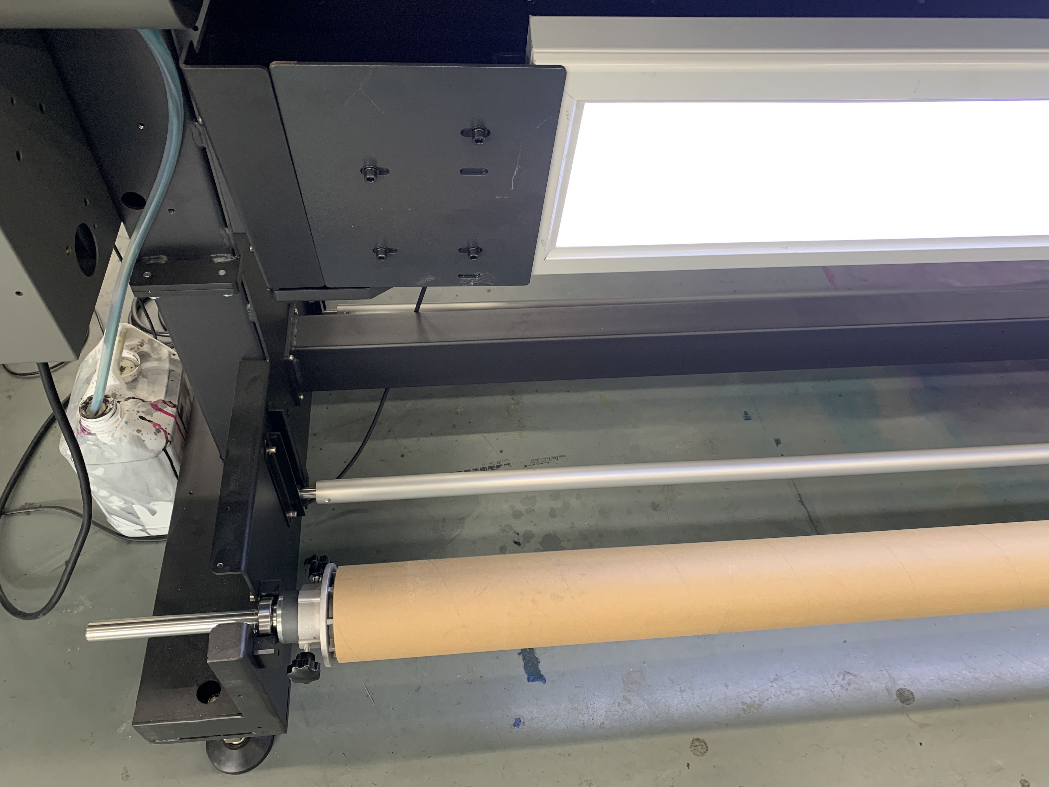 Принтер оснащён системой двойной подмотки: встроенная автоподмотка для широкоформатных материалов дополняется отдельной подмоткой с кронштейнами для одновременной работы с двумя узкими рулонами шириной 1,27–1,52 м. Это позволяет печатать на термочувствительных носителях без деформации и увеличивает производительность при работе с узкими форматами.